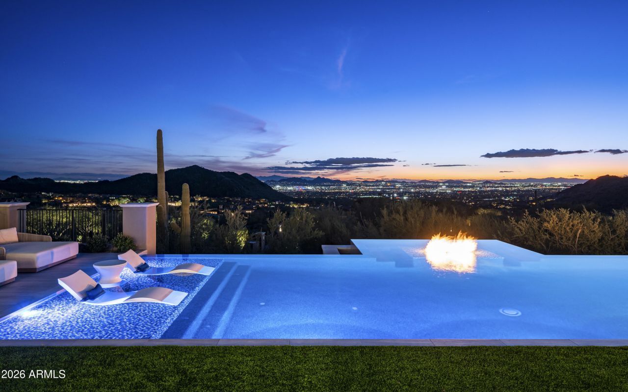 Welcome to Villa Sopra Le Luci! An Outstanding Luxury Estate in the prestigious guard gated Silverleaf Upper Canyon community and now available for purchase for the very first time. When beautifully designed interiors & architecture are harmoniously integrated into a fabulous floor plan and built on an elevated lot with explosive southwest city light, sunset, mountain, & golf course views; an Exceptional Estate is created. Built in 2021 this amazing home has no steps on the main level, rear yard & garage areas. The property is secured behind private automated gates and includes a total of 7 bedrooms, 7 full & 4 half baths, guest house, 5-car garage, theater room, office, game room w/ bar, indoor basketball court (could also be used for a golf simulator/wellness center/garage expansion /exercise gym/etc.), elevator, large great room, formal dining w/ wine wall, secondary family room upstairs, and a grand staircase.This one-of-a-kind home in the most desirable setting was created by a collaboration between the amazing homeowners, Simply Inspired Interior Design, Sommer Custom Homes, and architectural designer Luis Bonilla who are all very grateful to be part of such a wonderful undertaking.The front yard has lush gardens & fountains, a 21 tall limestone grand entry, and a steel & glass front door. The foyer welcomes you to a spectacular view of the city below, mountains near & far, and is surrounded by the luxurious interior finish & design details throughout the great room, dining room, gallery hallway, and grand staircase. The expansive great room has a gorgeous floor to ceiling book matched marble slab fireplace, a 30 wide automated pocket door system providing seamless integration between indoor & outdoor living areas, incredible coffered ceiling details, two chandeliers, cased millwork openings, and wide plank European white oak wood flooring.A highly upgraded Kitchen boasts an impressive 86 Lacanche gas range with custom metal vent hood to match, leathered natural quartzite countertops, 12 long island with seating & dual Miele dishwashers, Subzero 36 ref & 36 frz, beverage drawers, Wolf speed oven, great storage space with pullout drawers, organizers, and lift up doors to hide coffee makers & other small appliances. The ceiling details above the kitchen are dressed in layers of millwork with indirect lighting that complements the space below. Hidden behind the kitchen is a 22 long back kitchen workspace with 17 of countertop, a prep sink with disposal, additional appliances True brand custom color finish beverage drawers, ice maker, plus a full-size refrigerator. Other features are a trash pullout, & built-in microwave. On the opposite wall in this corridor there is another 12 of pantry storage with adjustable shelves and wire basket pullouts. The inviting formal dining area is located off the foyer and great room areas with cased openings into this space and is large enough to fit a table for 14. It has an amazing barrel ceiling with indirect lighting that has been finished with a herringbone mosaic tile to give it a subtle elegance and texture and a climate controlled 10 tall glass wine wall with led lighting with the back wall covered in split face stone and wine storage capacity of approximately 500 bottles. The main floor game room has a full wet bar with high bar counter for seating, Cristalo quartzite backlit slabs, lighted upper cabinets with glass & bottle display, a True refrigerator and Scotsman ice maker, guest bath with entry door hidden in wall paneling