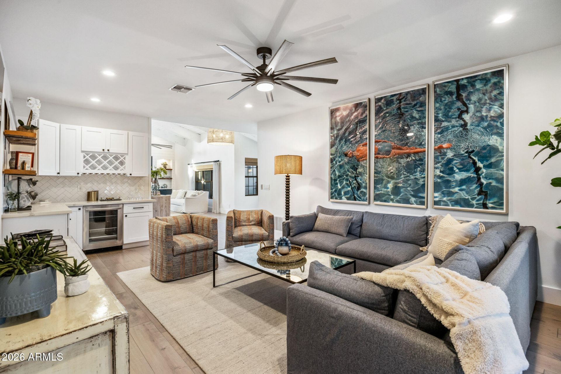 The ultimate retreat awaits within the guard-gated enclave of Pinnacle Peak Country Club Estates in North Scottsdale, where refined desert living meets timeless golf course elegance. Perfectly positioned along the 14th green of a private course, this updated residence with separate guest house offers a rare blend of tranquility, privacy and elevated design - tailored for the discerning buyer. Framed by soaring vaulted ceilings with exposed wood beams, the interiors are both expansive and inviting, anchored by warm hardwood flooring and a clean, contemporary aesthetic. Thoughtfully curated upgrades include a designer kitchen appointed with premium appliances, quartz surfaces and custom cabinetry - seamlessly connecting to open-concept living spaces designed for both everyday comfort and effortless entertaining. Walls of glass extend the living experience outdoors to a professionally designed backyard retreat overlooking the lush fairway. A resort-style pool and spa, generous patio spaces and multiple lounging areas create an ideal setting for year-round enjoyment - whether hosting under the Arizona sky or savoring quiet moments surrounded by desert serenity. Set within one of North Scottsdales most established golf communities, residents enjoy a lifestyle defined by scenic beauty, mature landscaping and proximity to world-class golf, dining, hiking and upscale amenities - offering the perfect balance of privacy, prestige and convenience.