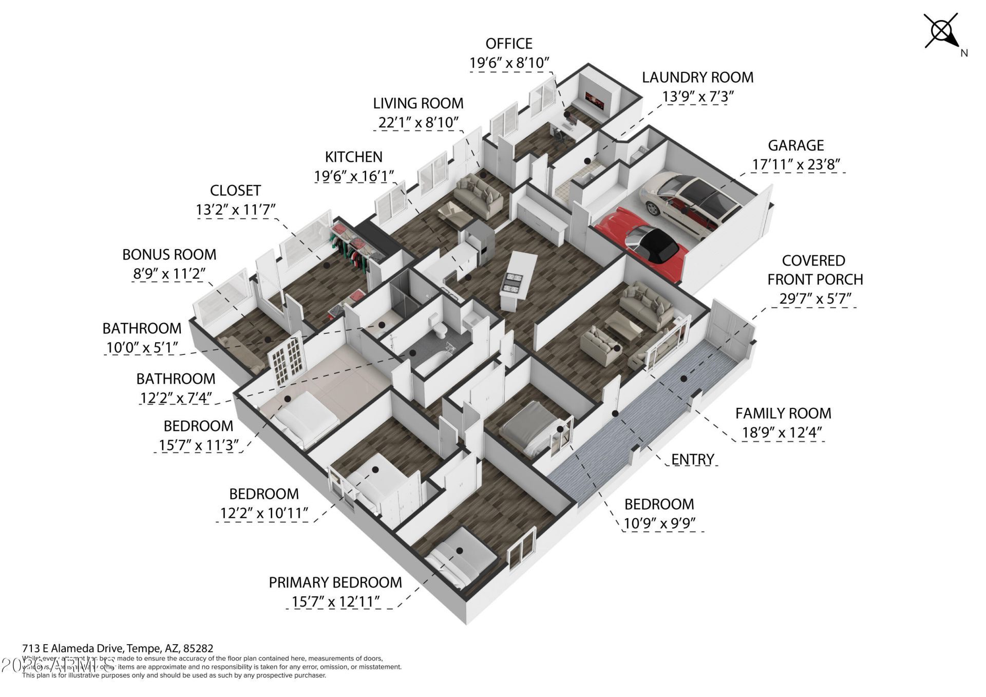 Welcome to this 5 bedroom, 2 bath home in Tempe, just minutes from ASU and Tempe Town Lake, offering space, comfort, and great value. A private front porch greets you and gives a nice place to relax. Inside, enjoy both a family room and a living room, giving you room to spread out and gather. The eat-in kitchen is bright with white cabinets, granite counters, and a gas stove, making it a great place to cook and enjoy meals. Grey wood-look vinyl flooring runs throughout the home for easy care and a clean look. The primary bedroom includes a bonus room that works well as a home office, along with a large walk-in closet and a walk-in shower. The other bedrooms are roomy, and there is an extra bonus room with a cozy fireplace for added comfort. The backyard is low maintenance with turf and a firepit, and it offers plenty of space to design your own outdoor oasis. This home is a great fit for a primary home or an investment, with a prime location close to schools, dining, and entertainment, making it a must-see in Tempe.