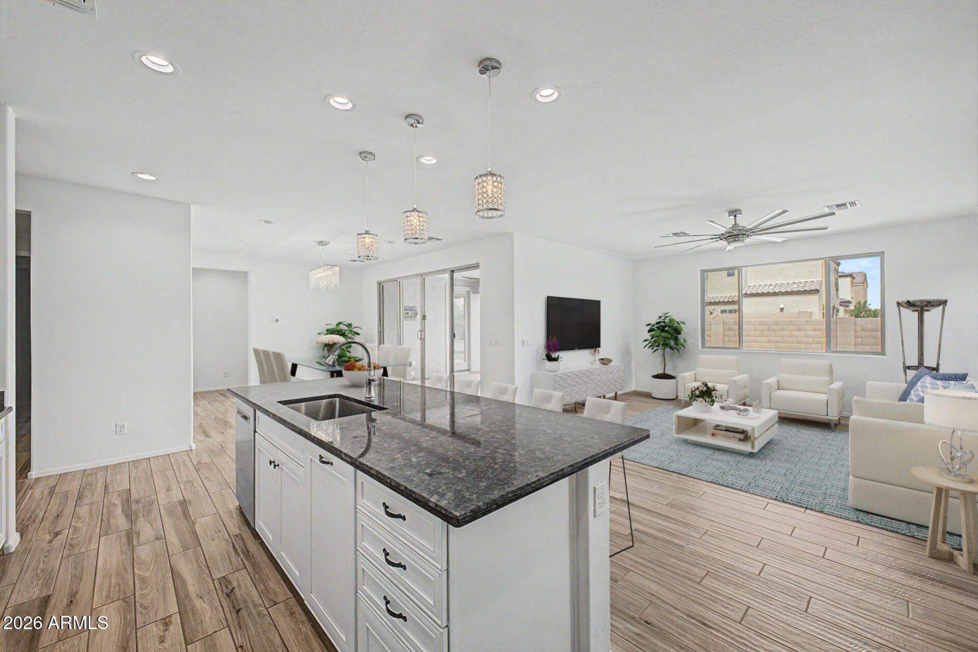 RV garage & a pool! This highly upgraded home features 3 bedrooms, Den & 2.5 bathrooms. Throughout you will notice fresh interior paint, 8 doors, abundance of recessed lighting & plank tile floors (everywhere except the bedrooms/den). The kitchen offers white cabinets with black handles (dovetail/ soft close drawers), Granite countertop, Stainless steel appliances (fridge included), Walk in pantry, Island with seating & upper/lower cabinet lighting. The primary suite overlooks the backyard with private exit to the back patio, Double sinks with granite top, huge soaking tub & custom tiled shower with frameless glass. Large walk-in closet that has a passthrough to the laundry room! Out back there is covered patio, lots of travertine pavers, putting green and accent lighting. Pebbletec pool with baja step & water feature is ready for your enjoyment! The RV garage features professionally epoxied floor, climate controlled with a mini split a/c, utility sink, lots of outlets including 220 for your electric car, RV or welder. 15 ceilings give plenty of room for a car lift & a 14 tall door to fit a class A RV! Walking distance to schools, 1 mile to shopping/ restaurants & close to the 202/ I10 freeways!